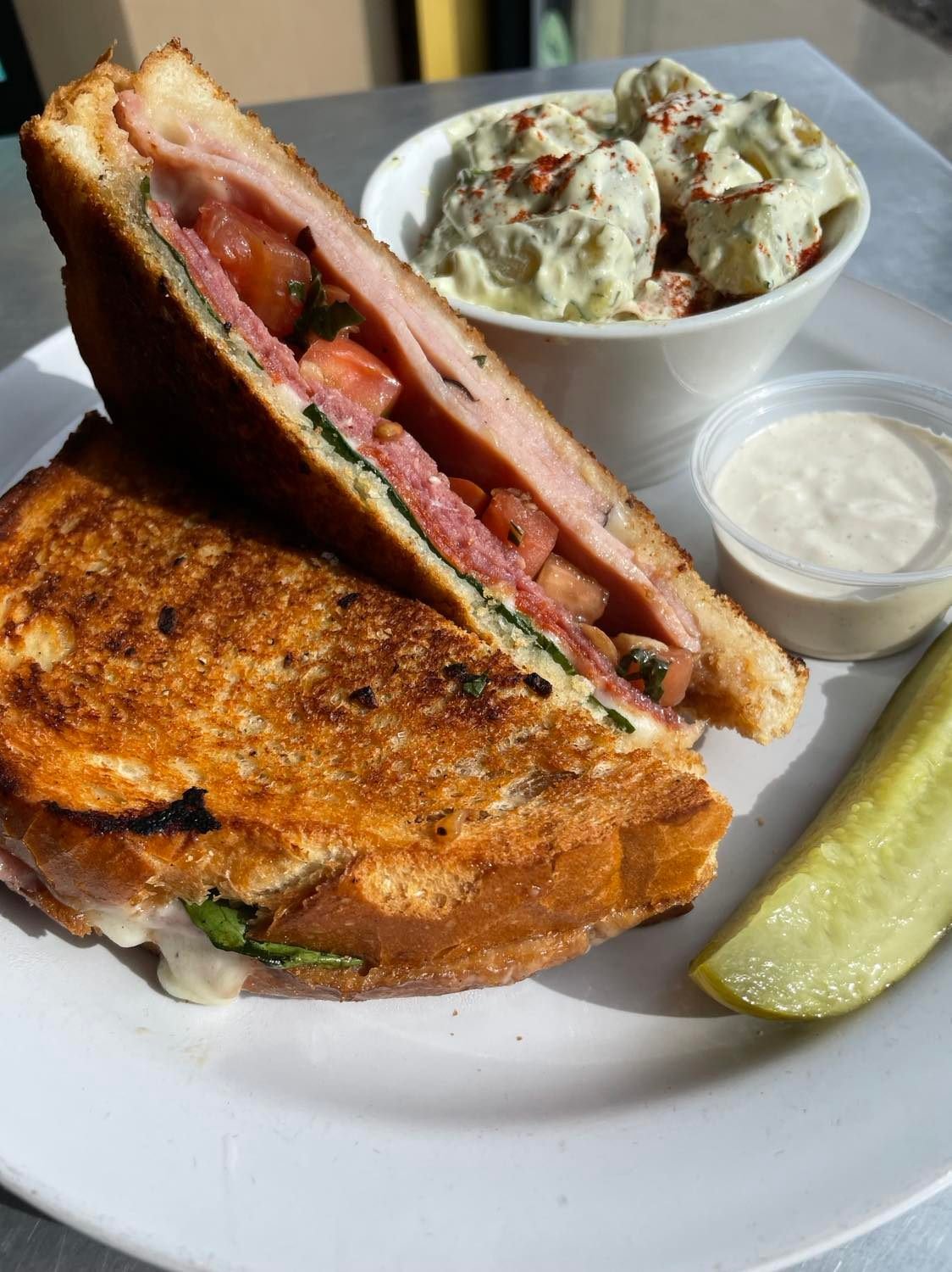 Ham, salami, pepperoni, spinach, melted provolone cheese and bruschetta on toasted sourdough garlic bread. Served with potato salad or chips and a pickle.